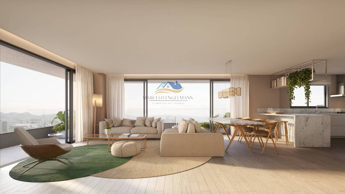 Apartamentos de 147m² de área privativa, sala de estar/jantar com portas de vidros dando acesso à sacada, 1 suíte e 2 demi-suítes, lavabo, área de serviço, cozinha com churrasqueira e opção de garagem para 3 carros.