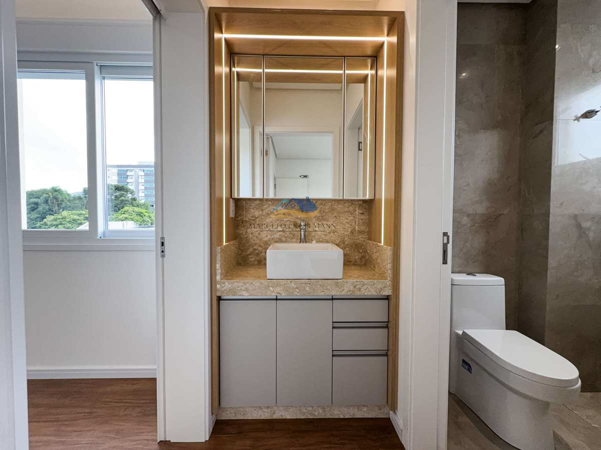 São 3 dormitórios, sendo 1 suíte e 2 demi-suítes, distribuídos de forma inteligente para proporcionar privacidade e funcionalidade. A área social é composta por sala de estar e sala de jantar integradas, além de cozinha com móveis sob medida, churrasqueira e lavanderia independente. Os banheiros também possuem móveis planejados, agregando praticidade e sofisticação.