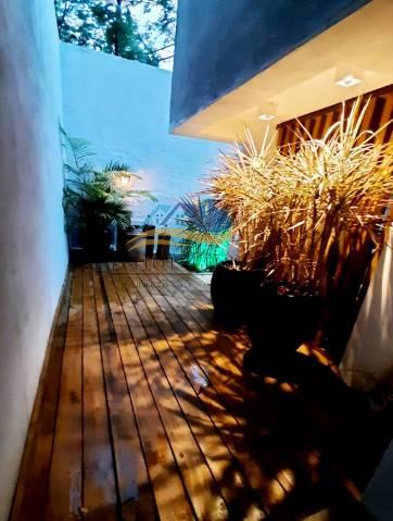 Garagem com espaço gourmet onde encontra-se churrasqueira, fogão campeiro, pia e lavabo. Bar com bancada anexo a cozinha.